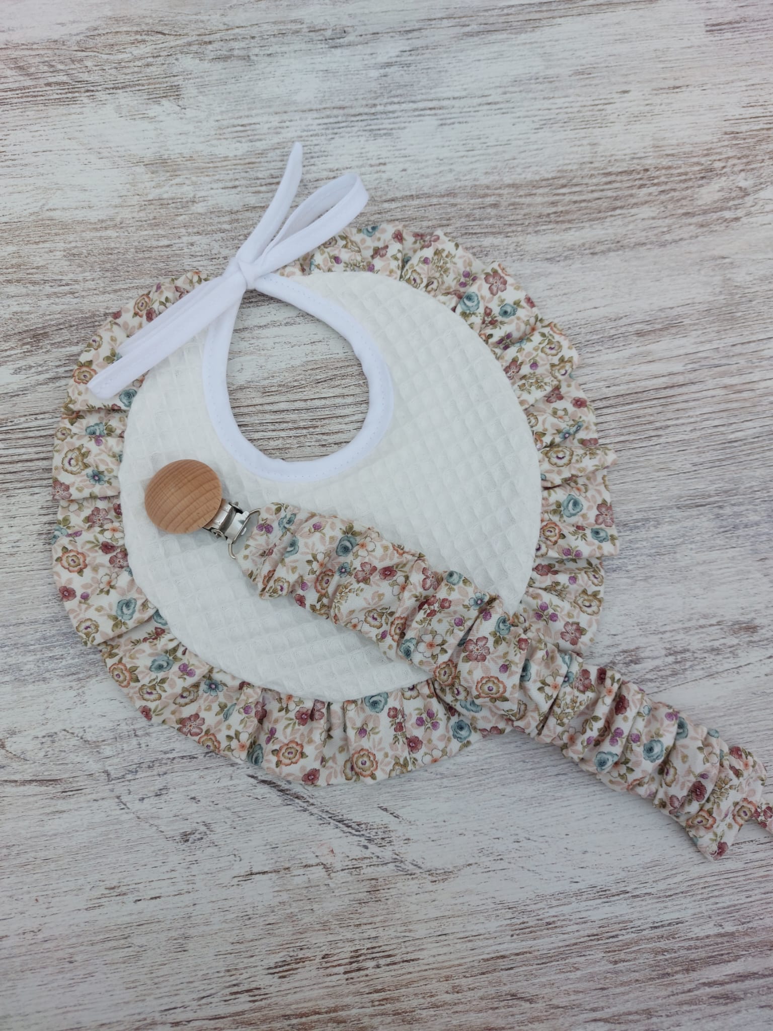 Precioso babero con volante y chupetero a juego. Todos nuestros productos están confeccionados con tejidos de calidad certificada, entre ellos se encuentra el rizo de bambú orgánico que utilizamos en este caso para la parte interior del baberito por sus cualidades hipoalergénicas y la  suavidad extra que les aporta.