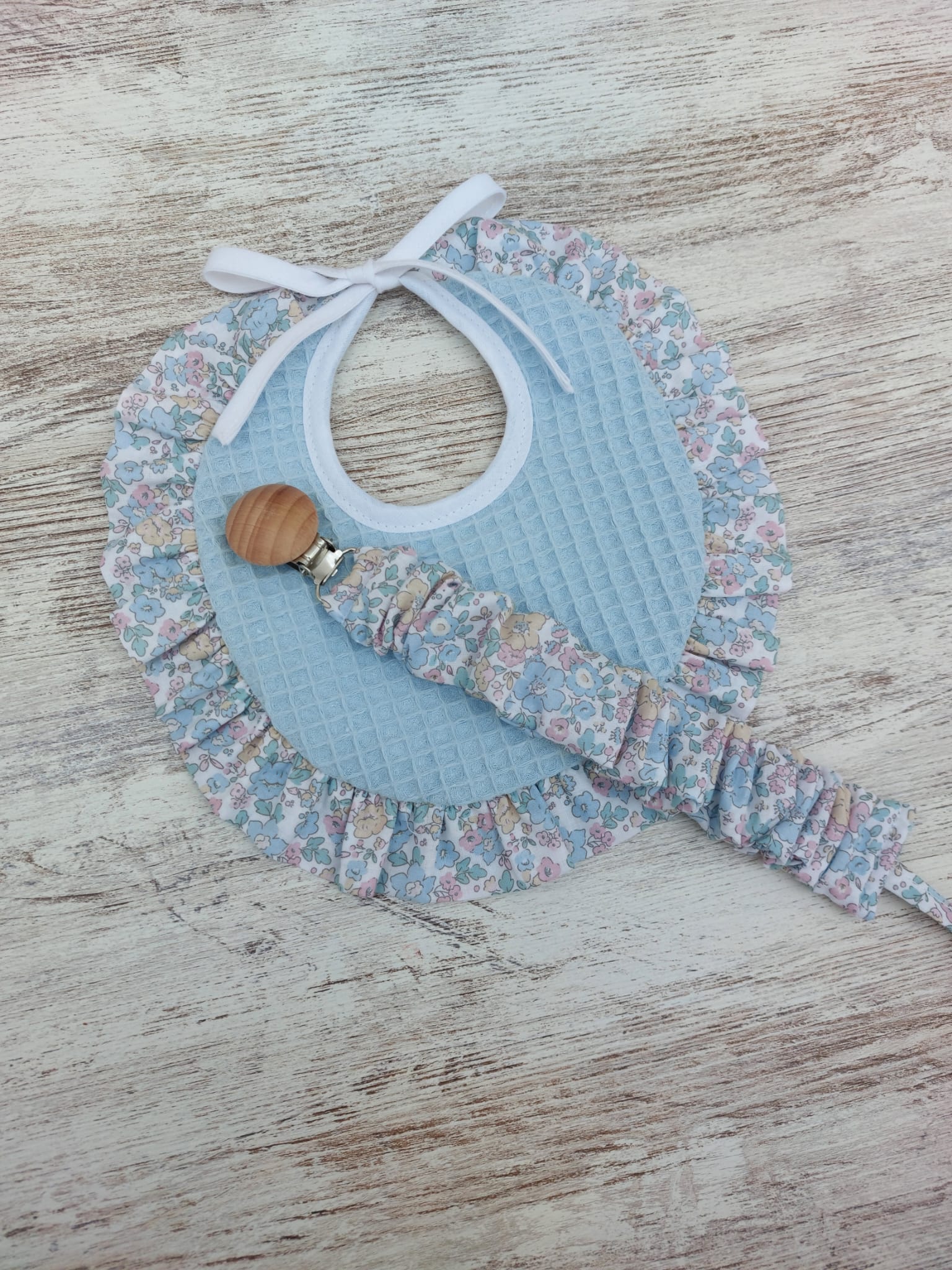 Precioso babero con volante y chupetero a juego. Todos nuestros productos están confeccionados con tejidos de calidad certificada, entre ellos se encuentra el rizo de bambú orgánico que utilizamos en este caso para la parte interior del baberito por sus cualidades hipoalergénicas y la  suavidad extra que les aporta.