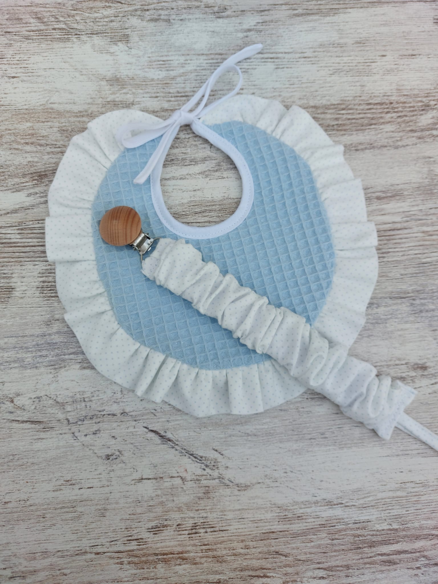 Precioso babero con volante y chupetero a juego. Todos nuestros productos están confeccionados con tejidos de calidad certificada, entre ellos se encuentra el rizo de bambú orgánico que utilizamos en este caso para la parte interior del baberito por sus cualidades hipoalergénicas y la  suavidad extra que les aporta.