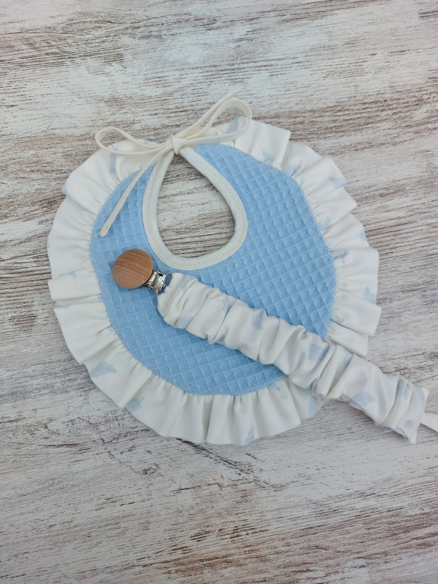 Precioso babero con volante y chupetero a juego. Todos nuestros productos están confeccionados con tejidos de calidad certificada, entre ellos se encuentra el rizo de bambú orgánico que utilizamos en este caso para la parte interior del baberito por sus cualidades hipoalergénicas y la  suavidad extra que les aporta.