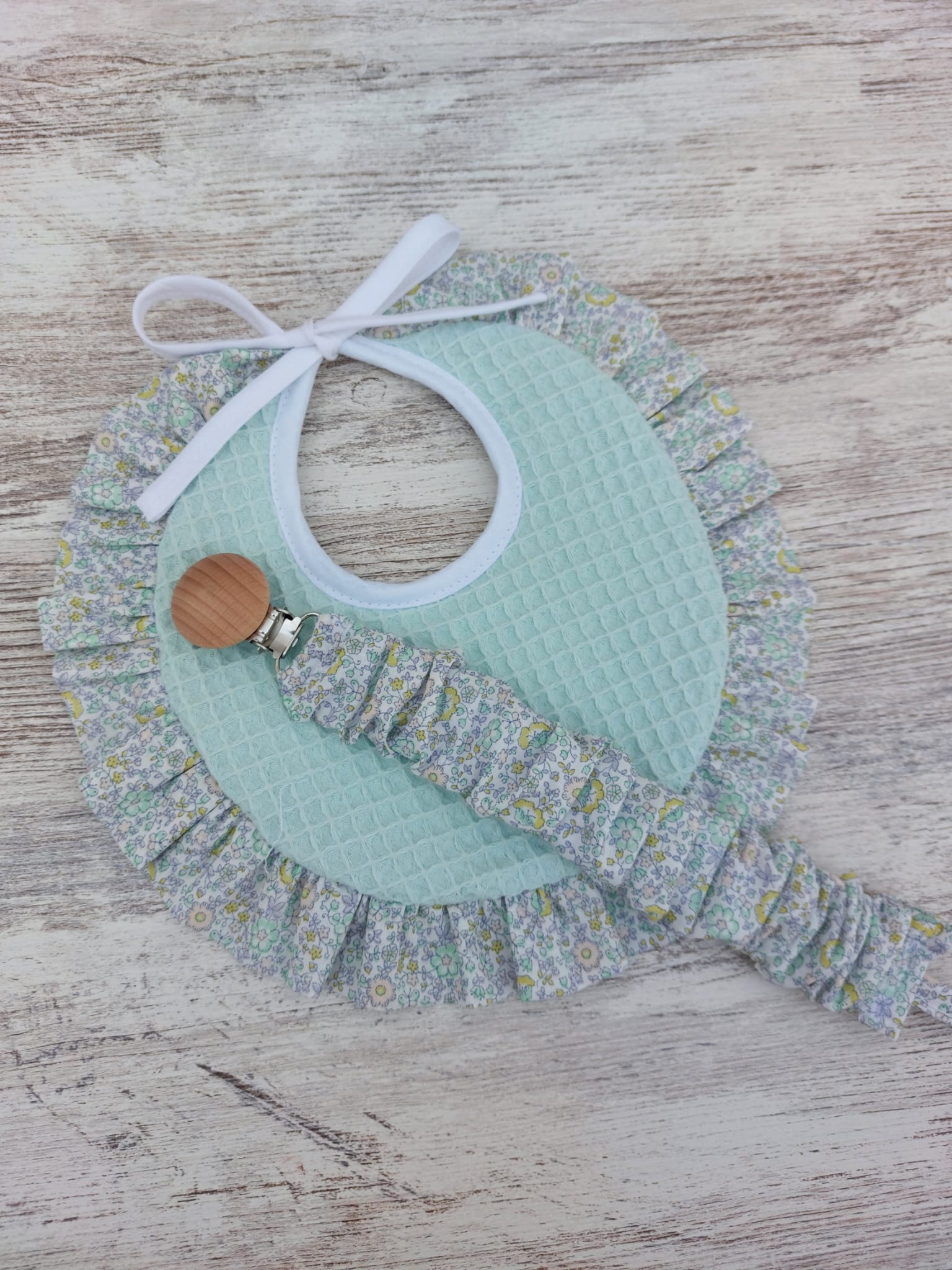 Babero y chupetero waffle verde agua/florecillas